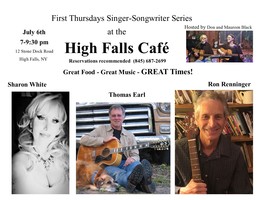 ![]() Thursday 7:00 pm to 9:30 pm | First Thursdays Singer Songwriter Series with Maureen Black, Sharon White, Thomas Earl, Ron Renninger Singer-Songwriter | High Falls Cafe 12 Stone Dock Road High Falls, NY See Map |