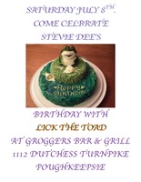 WELL IT'S STEVIE DEE'S BIRTHDAY CELEBRATION AND WHERE ELSE BUT GROGGERS COULD HOLD SUCH A WILD TIME!! SO COME ON OUT BRING YOUR ROCK N' ROLL SHOES AND GET READY FOR SOME WILD-ASS ROCK N' ROLL WE WILL BE HANDING OUT (THROWING INTO THE CROWD) PARTY FAVORS AND HAVING OUR TYPICAL SILLY TIME!! SO COME ON OUT AND WISH STEVE A HAPPY BIRTHDAY AND PARTY WITH THE BAND THAT BRINGS OUT YOUR INNER CHILD!!!.........LICK THE TOAD!!! WE CAN'T WAIT TO SEE YOU!STUFF | ||
