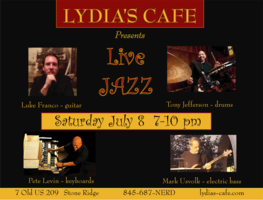 Saturday 7:00 pm to 10:00 pm | Pete Levin - keys, Luke Franco - guitar, Tony Jefferson - drums, Mark Usvolk - bass Jazz, Latin | Lydia's Cafe & Bar 7 Old US Highway 209 Stone Ridge, NY See Map |