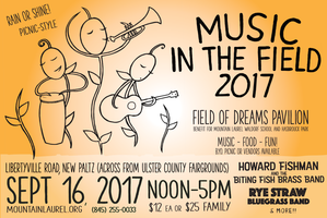 Saturday 12:00 pm to 5:00 pm | Music In The Field, Howard Fishman and the Biting Fish Brass Band, Rye Straw Bluegrass Band Bluegrass | Field of Dreams Park Pavillion Libertyville Rd New Paltz, NY See Map |
