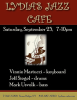Saturday 7:00 pm to 10:00 pm | Piano Jazz with Vinnie Martucci, Jeff Siegel - drums, Mark Usvolk - bass Jazz, Latin | Lydia's Cafe & Bar 7 Old US Highway 209 Stone Ridge, NY See Map |