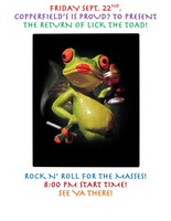 WELL LICK THE TOAD TETURNS TO COPPERFIELD'S WE WILL BE KEEPING THE VOLUME DOWN FOR ABOUT THE FIRST 40 MINUTES OR SO ...SO WE DON'T DISRUPT THE DINNER CROWD THEN WE WILL KICK INTO THE USUAL ROCK N' ROLL LUNACY WE ARE KNOWN FOR!!! SO COME ON OUT AND PARTY WITH THE BAND THAT BRINGS OUT YOUR INNER CHILD!!.........LICK THE TOAD!! SEE YA THERE!!STUFF | ||