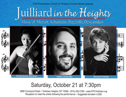 Saturday 7:30 pm to 9:30 pm | Classical Music for Halloween with Juilliard in the Heights, Simona Frenkel, piano, Vasko Dukovski, clarinet , Emilie-Anne Gendron , violin Classical/Opera | First Presbyterian Church of Yorktown 2880 Crompond Road, Yorktown Heights, NY 10598. , NY See Map |