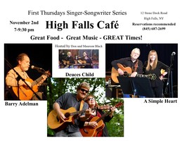 ![]() Thursday 7:00 pm to 9:30 pm | First Thursdays Singer Songwriter Series with Don and Maureen Black, Barry Adelman, Deuces' Child, A Simple Heart Singer-Songwriter | High Falls Cafe 12 Stone Dock Road High Falls, NY See Map |