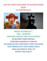 WELL LICK THE TOAD'S WELCOME TO OUR NIGHTMARE HALLOWEEN ROCK N' ROLL PARTY CONTINUES THIS YEAR AT COPPERFIELD'S!! WITH ALL THE ROCK N' ROLL LUNACY YOU'VE COME TO EXPECT FROM THOSE GUYS!! THERE WILL BE A COSTUME CONTEST WITH CASH PRIZES! $5.00 DRAFT BEER SPECIALS.....ALL THE WILD - ASS ROCK N' ROLL YOU CAN HANDLE ...... ON A SAD NOTE LICK THE TOAD WILL BE THE LAST BAND TO PERFORM AT THIS ESTABLISHMENT AS THEY WILL BE CLOSING THEIR DOORS FOR GOOD AT THE END OF BUSINESS ON SUNDAY NOVEMBER 4TH. WE WISH THEM THE BEST OF LUCK IN THE FUTURE AND WANT THEM TO KNOW THEY WILL BE MISSED BY ALL! SO GET DRESSED UP AND COME ON OUT AND PARTY WITH THE BAND YOUR PARENTS WARNED YOU ABOUT!..............LICK THE TOAD!!! SEE YA THERE!STUFF | ||