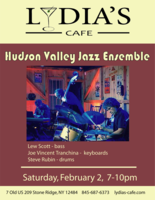 Saturday 7:00 pm to 10:00 pm | Hudson Valley Jazz Ensemble, Lew Scott - bass, Joe Vincent Tranchina - keyboards, Steve Rubin - drums Jazz | Lydia's Cafe & Bar 7 Old US Highway 209 Stone Ridge, NY See Map |