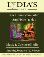 Saturday 7:00 pm to 10:00 pm | Music & Cuisine of India, Noe Dinnerstein - sitar, Ami Fixler - tablas Middle Eastern | Lydia's Cafe & Bar 7 Old US Highway 209 Stone Ridge, NY See Map |