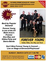 "Back by Popular Demand" ...DOO WOP & OLDIES CONCERT AT ELMWOOD PLAYHOUSE - FEATURING "FOREVER YOUNG" - SUNDAY, MARCH 24th - 7:00 PM Forever Young, one of the NY Metro Area's Premier Golden Oldies & Doo Wop Party and Dance Bands will be appearing in concert - on stage at Elmwood Playhouse on Sunday, March 24th at 7:00pm. This promises to be a fun evening of the best in oldies and doo wop! Tickets are $15 General Admission. Order online or call (845) 353-1313. Members of the group include Stuart Iselin (keyboard & vocals), Ira Bernstein (bass guitar & vocals), Barney Griffin (lead guitar & vocals), Peter Karanikis (rhythm guitar & vocals), Alan Vaccaro (sax & vocals) and Bruce Pollack (drums & percussion). Elmwood Playhouse is located at 10 Park Street in Nyack, NY For more information on this show, and to order tickets, please visit: https://elmwoodplayhouse.com/specialevent/forever-young-returns-to-elmwood-march-24 Please click here for more info & to order tickets | ||