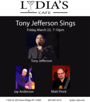 Friday 7:00 pm to 10:00 pm | Tony Jefferson Sings, Tony Jefferson - vocals, Jay Anderson - bass, Matt Finck - guitar Jazz | Lydia's Cafe & Bar 7 Old US Highway 209 Stone Ridge, NY See Map |