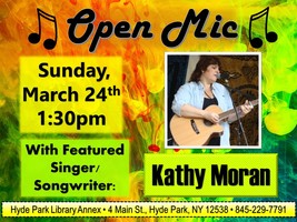 Sunday 1:30 pm | Open Mic at HPFL Library w/ featured act K. Moran with Kathy Moran Acoustic, Folk/Traditional, and Singer-Songwriter | Hyde Park Free Library Annex 2 Main St. Hyde Park, NY See Map |