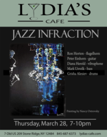 Thursday 7:00 pm to 10:00 pm | Jazz Infraction, Ron Horton - flugelhorn, Peter Einhorn - guitar, Diana Herold - vibraphone, Grisha Alexiev - drums, Mark Usvolk - bass Jazz, Latin | Lydia's Cafe & Bar 7 Old US Highway 209 Stone Ridge, NY See Map |