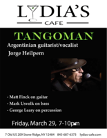 Friday 7:00 pm to 10:00 pm | Jorge "Tangoman" Heilpern, Matt Finck - guitar, George Leary - percussion, Mark Usvolk - bass Latin | Lydia's Cafe & Bar 7 Old US Highway 209 Stone Ridge, NY See Map |