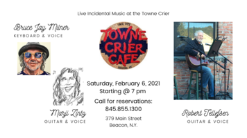 Two sets: Bruce & Marji from 7 to 8 and Robert Tellefsen from 8 to 9. So, grab your mask and your favorite person(s) and come to the Towne Crier on Saturday, February 6. You'll be glad you did! Reservations are strongly recommended: 845-855-1300 The Towne Crier is deeply committed to its diners' and performers' safety (and their own!). To that end, they follow very strict guidelines to keep everyone safe and to keep music alive (thank you, Towne Crier!!) Visit Towne Crier's Website to learn more | ||