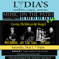 Saturday 7:00 pm to 10:00 pm | Pete Levin Trio, Pete Levin - keys, Mike DeMicco - guitar, Jeff Siegel - drums Jazz | Lydia's Cafe & Bar 7 Old US Highway 209 Stone Ridge, NY See Map |