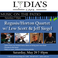 Saturday 7:00 pm to 10:00 pm | Regusis/Horton Quartet, Tim Regusis - piano, Ron Horton - trumpet & flugelhorn, Lew Scott - bass, Jeff Siegel - drums Jazz | Lydia's Cafe & Bar 7 Old US Highway 209 Stone Ridge, NY See Map |
