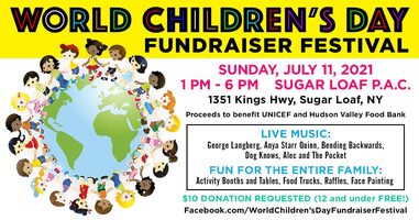 The World Children's Day Fundraiser Festival will be held on July 11th, from 1-6pm, at the Sugar Loaf Performing Arts Center, in Chester NY, with half of proceeds raised going to the Hudson Valley Food Bank, and the other half going to UNICEF. We'll have live music, raffles, food trucks, and various other venues (List to be updated!). We are asking for a $10 dollar donation upon entry; people aged 12 and under are free. Please contact jacobmott625@gmail.com if you have any questions. We hope to see you there!