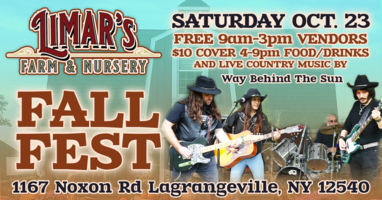 Saturday 6:00 pm to 9:00 pm | Fall Fest with REAL COUNTRY MUSIC with Way Behind The Sun Country | Limar's Farm & Nursery 1167 Noxon Road Lagrangeville, NY See Map |