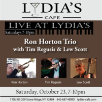 Saturday 7:00 pm to 10:00 pm | Duck & Cover - Featuring Ron Horton Trio & Our Cri, Ron Horton - trumpet, Tim Regusis - piano, Lew Scott - bass Jazz | Lydia's Cafe & Bar 7 Old US Highway 209 Stone Ridge, NY See Map |
