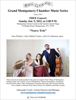 Sunday 3:00 pm to 5:00 pm | January 9, 2022 Free Concert with Neave Trio, Aleksander Vezuli Classical/Opera | Howard Garrett Stage at Senior Center, Montgomery 36 Bridge Street Montgomery, NY See Map |