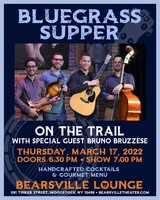 PRE SHOW: BEARSVILLE BLUEGRASS JAM – March 17th- FREE ADMISSION FROM 4PM TO 6PM Sponsored by: The Hudson Valley Bluegrass Association, Connecticut Bluegrass Association and Adirondack Bluegrass League AND THE SHOW… Bluegrass Supper Series at Bearsville Theater On the Trail with Special Guest Bruno Bruzzese Plus a St. Patty's Day Dinner! | ||