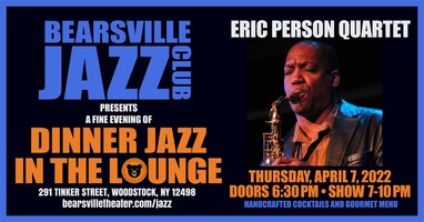 Thursday 7:00 pm to 10:00 pm | Jazz Dinner Club at Bearsville Theater Featuring Eric Person Quartet with Eric Persono Jazz | Bearsville Theater 291 Tinker St Woodstock, NY See Map |