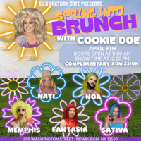 Silk Factory Café presents Spring Into Brunch with Cookie Doe! Come enjoy all of our café eats and drinks from our bar while these queens take the stage 🌈