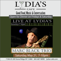 Saturday 7:00 pm to 10:00 pm | Marc Black Trio Folk/Traditional, Pop/Soft Rock | Lydia's Cafe & Bar 7 Old US Highway 209 Stone Ridge, NY See Map |