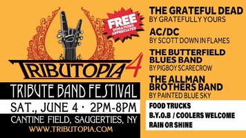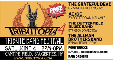 Saturday 2:00 pm to 8:00 pm | Tributopia 4, Gratefully Yours, Pig Boy Scarecrow -Paul Butterfield Tribute, Painted Blue Sky- Allman Bros Tribute, Scott Down in Flames- AC/DC Tribute Rock (classic), Blues | Cantine Memorial Field Pavillion Street Saugerties, NY See Map |