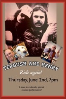 Terbush and Henry will be riding once again after many years to bring you a stunning show of new and old songs played in a bluegrassy/folk style--with room for some little genre surprises. Gary TerBush the leader of the Bush Bros. has brought bluegrass music to the Hudson Valley for half a century. Kurt Henry, the leader of Kurt Henry and Dog Knows is also a member of the famous Dharma Bums. There will be some additional support on percussion and harmonica by Cheryl Lambert, a.k.a, Lady Harmonica. Come on down. We'll make you happy!