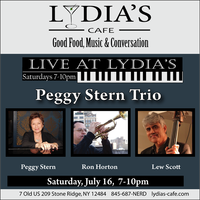 Saturday 7:00 pm to 10:00 pm | Peggy Stern Trio, Peggy Stern - piano, Ron Horton - trumpet, Lew Scott - bass Jazz, Latin | Lydia's Cafe & Bar 7 Old US Highway 209 Stone Ridge, NY See Map |