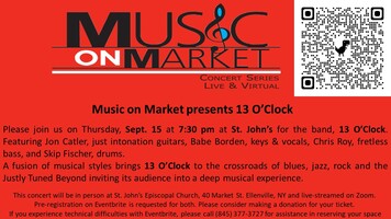 A fusion of musical styles brings 13 O’Clock to the crossroads of blues, jazz, rock and the Justly Tuned Beyond inviting its audience into a deep musical experience. This concert will be in person at St. John's, 40 Market St. Ellenville, NY and live-streamed on Zoom. Our beverage vendor, Forthright Cyder will be available before, during and after the show! Pre-registration on Eventbrite is requested for both. Please consider making a donation for your ticket. Click the link to reserve your space. If you experience technical difficulties with Eventbrite, please call (845) 377-3727 for assistance in reserving your space. Reserve your space here! | ||