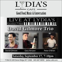 Saturday 7:00 pm to 10:00 pm | David Gilmore Trio, David Gilmore - guitar, Gary Versace - organ, Peter O'Brien - drums Jazz, Funk | Lydia's Cafe & Bar 7 Old US Highway 209 Stone Ridge, NY See Map |