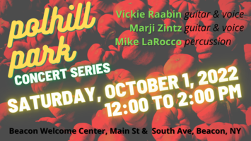 ![]() Saturday 12:00 pm to 2:00 pm | Polhill Park Concert Series with Marji Zintz, Vickie Raabin (guitar & voice), Mike LaRocco (percussion) Americana, Acoustic. all the stuff you love! | Beacon Welcome Center Polhill Park Beacon, NY See Map |
