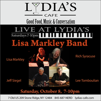 Saturday 7:00 pm to 10:00 pm | Lisa Marley Band, Lisa Markley — vox, guitar, ukulele, et al , Lee Tomboulian— keys, Rich Syracuse — most uprighteous bass, Jeff “Siege” Siegel — drums Jazz, Americana | Lydia's Cafe & Bar 7 Old US Highway 209 Stone Ridge, NY See Map |