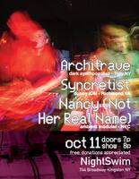 Saturday 7:00 pm to 11:00 pm | FREE Synth/Electronic Showcase, Architrave, Syncretist, Nancy (Not Her Real Name) Electronic, Dance, and Rock (modern). Electronic Pop, New-Wave | Night Swim 744 Broadway Kingston, NY See Map |