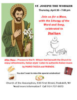 Thursday 7:00 pm to 9:00 pm | Special Italian Mass Celebration in Honor of St. Joseph the Worker with Mario Tacca World. Italian | Church of the Assumption 920 First Street Peekskill, NY See Map |