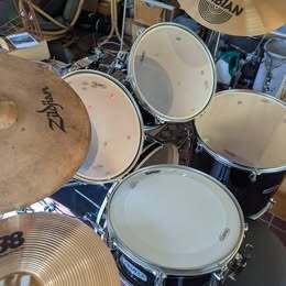 Mapex Drums SetMapex Jet Black 5 Piece Drum Set with 22" x 18" bass drum, 14" x 5.5" snare drum, 16" x 16" floor tom, 12" x 10" tom, 13" x 12" tom, stool, bass drum pedal, hi hat stand, snare drum stand, new 18" Sabian cym. & stand, 16" Zildjian Cym.& standand new 14" Sabian hi hats & drum key. OBO !